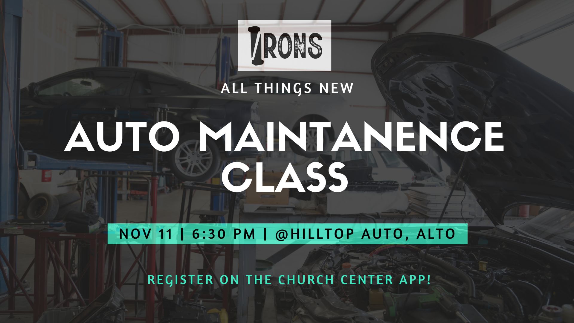 Our next class will be on Auto Maintenance on Tuesday, November 11 at 6:30pm at Hilltop Repair Services in Alto. Our very own Jon Puhek will again lead the class.