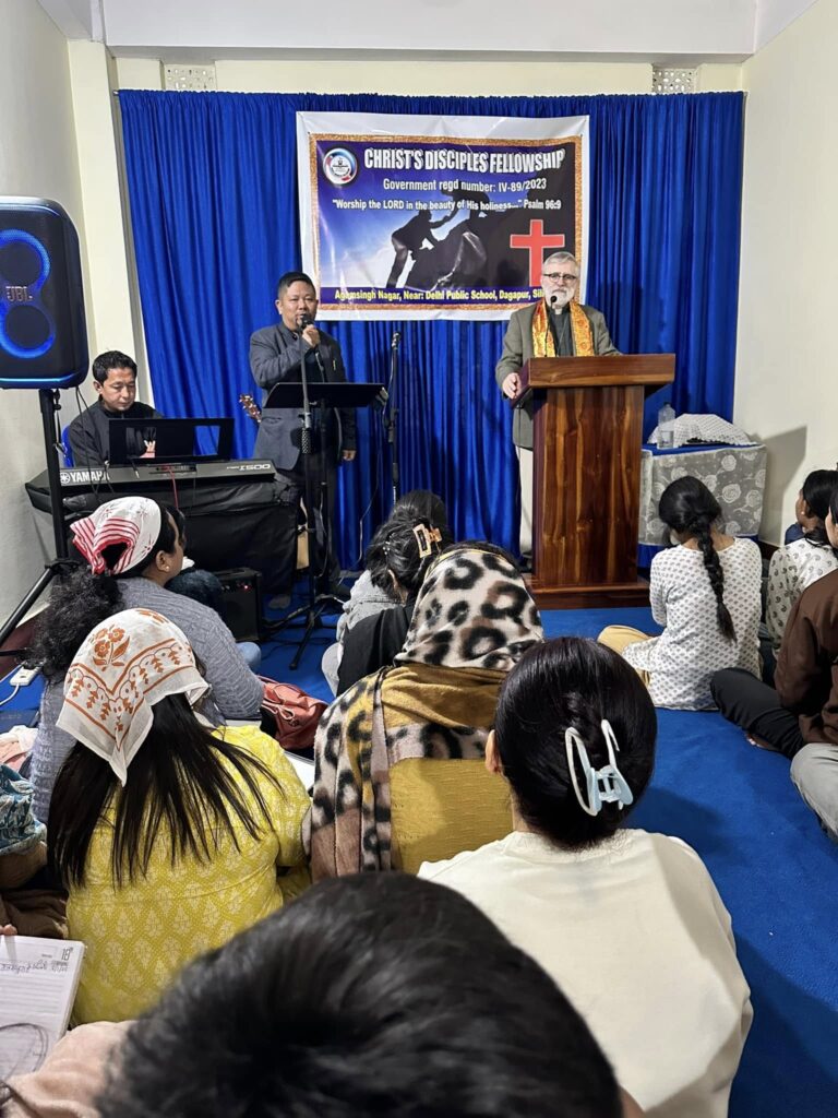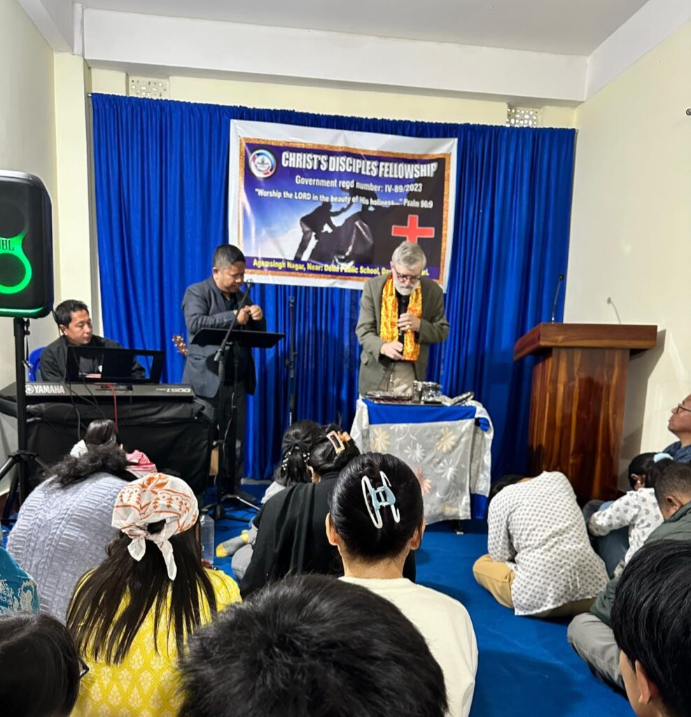 Rev. Dr. Michael Albrecht is the other pastor I am traveling with, and he preached at the service. Pastor Albrecht has been partnering with BFLMI since around 1995. He began the Symposium (the pastors conference) in 2007, bringing speakers from around the world. Initially, it was held only in Guntur; 10 years later, Pastor Albrecht met Sachin. The two developed a friendship and mentorship, as Sachin was eager to learn more and pursue ministry. In early 2020, Pastor Albrecht ordained Sachin. By 2021, the first symposium in Siliguri was held.