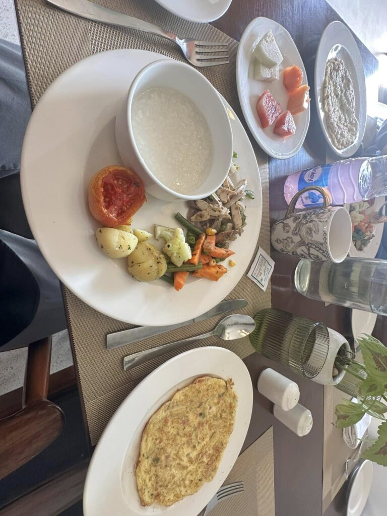 Our hotel breakfast. Sautéed chicken and vegetables, roasted tomato, potatoes, fruit and porridge. The waiter saw these two obvious Americans and asked if we wanted an omelette. Yes, yes I do.