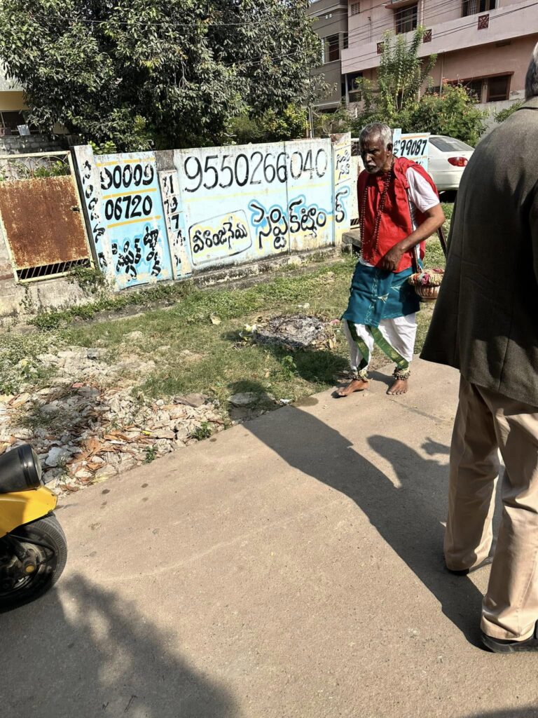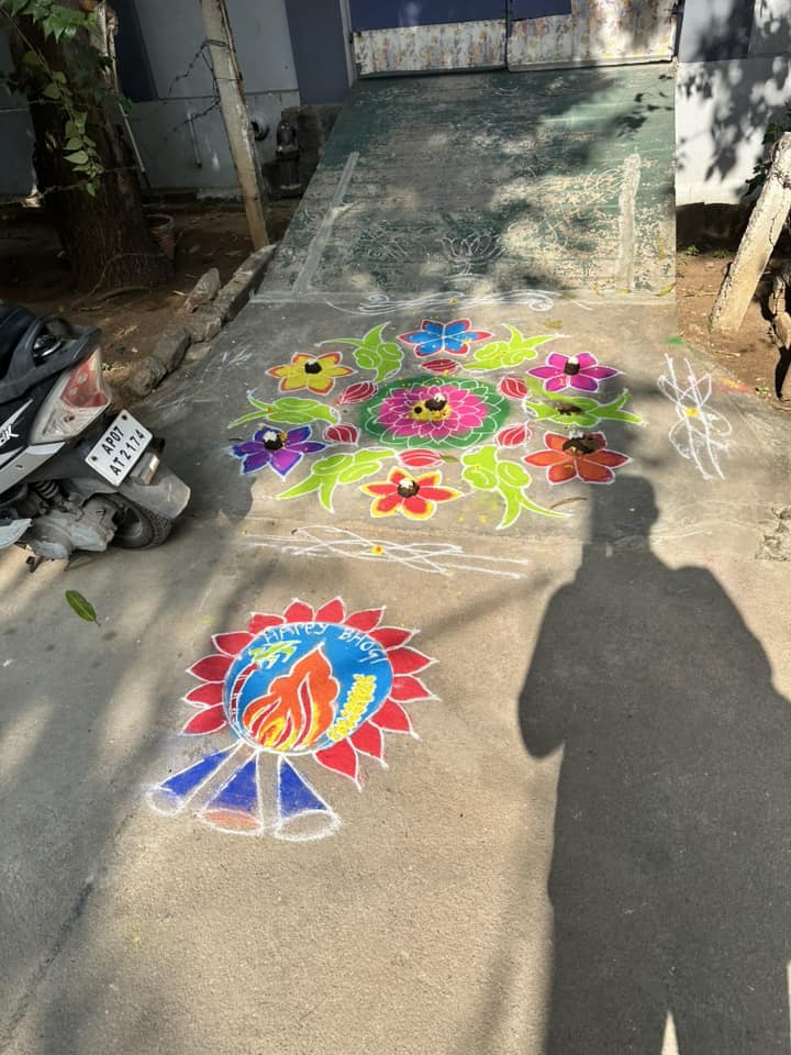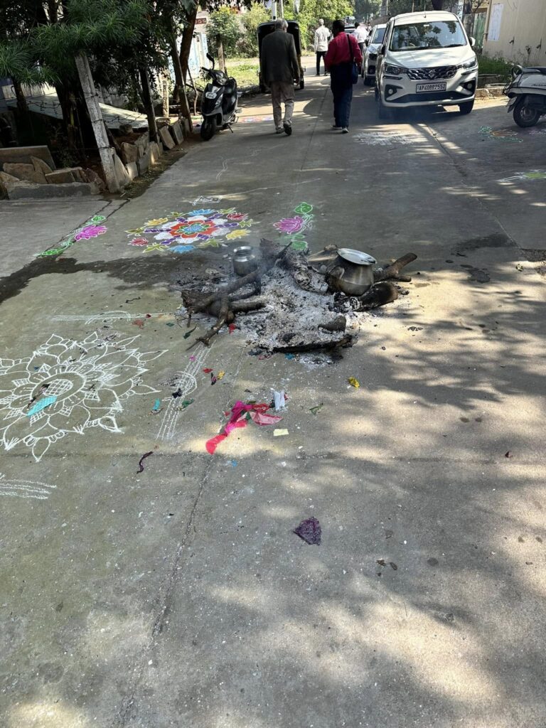 While we are in Guntur, we’re staying in rooms at the Moriah School. It’s a private, residential school for disadvantaged children, teaching both academics and a love for Jesus. This is some sort of sand art on the ground; something we’ve seen in a number of places.In the street outside the Moriah School, neighbors are engaging in the festival of Boghi, a Hindu celebration. The sand art here is part of that, as is the burning (the smell of its smoke woke me up in the night). I was told that the idea is to empty your house and whitewash it, then have a swaami (a type of priest) bless it to cast out evil spirits to help ensure a good year. Here’s what Wikipedia has to say about it: